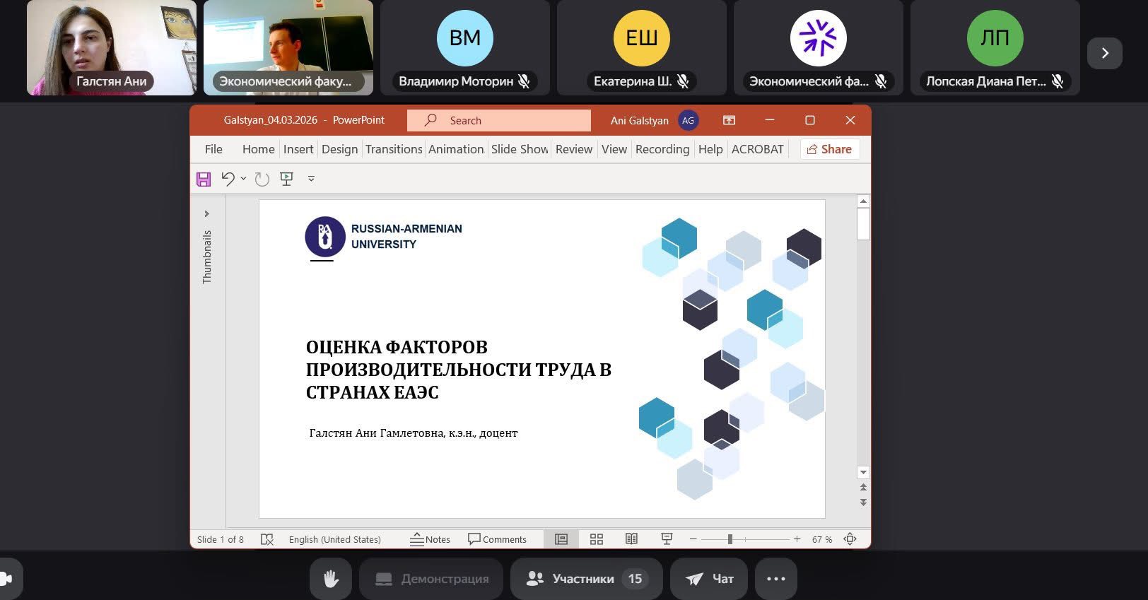 Համաժողովի աշխատանքներին հեռակա ձևաչափով մասնակցել է նաև տնտեսագիտության և ֆինանսների ամբիոնի դոցենտ Անի Գալստյանը՝ «ԵԱՏՄ երկրների աշխատանքային արտադրողականության գործոնների գնահատումը» թեմայով զեկույցով։
