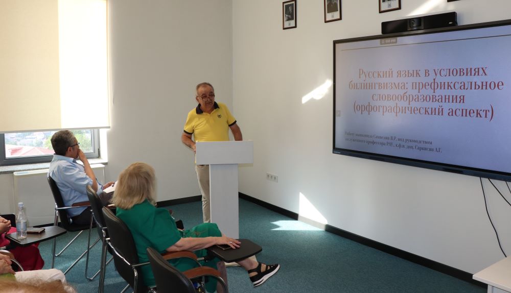 At the workshop, Arshak Sarkisyan, PhD in Philology, Associate Professor, Honorary Professor, and Associate Professor of the Department of Russian Language and Professional Communication at RAU, also presented a report together with Nelly Samvelyan, a student in Philology. The report analyzed 74 etymologically Russian prefixes (morphemes) presented in the Dictionary of Morphemes of the Russian Language (Kuznetsova A., Efremova T..Moscow, 1986), as well as affixoids such as arche-, mega-, nano-, and others, recorded by Z.Atsagortsian and S. Aslanyan in the Russian-Armenian Dictionary of International Terminology Elements (Yerevan, 1989). The presenter emphasized that prefixal word formation is an important tool in teaching Russian as a foreign language, as it not only helps expand learners’ vocabulary but also promotes a better understanding of the structure of the Russian language.