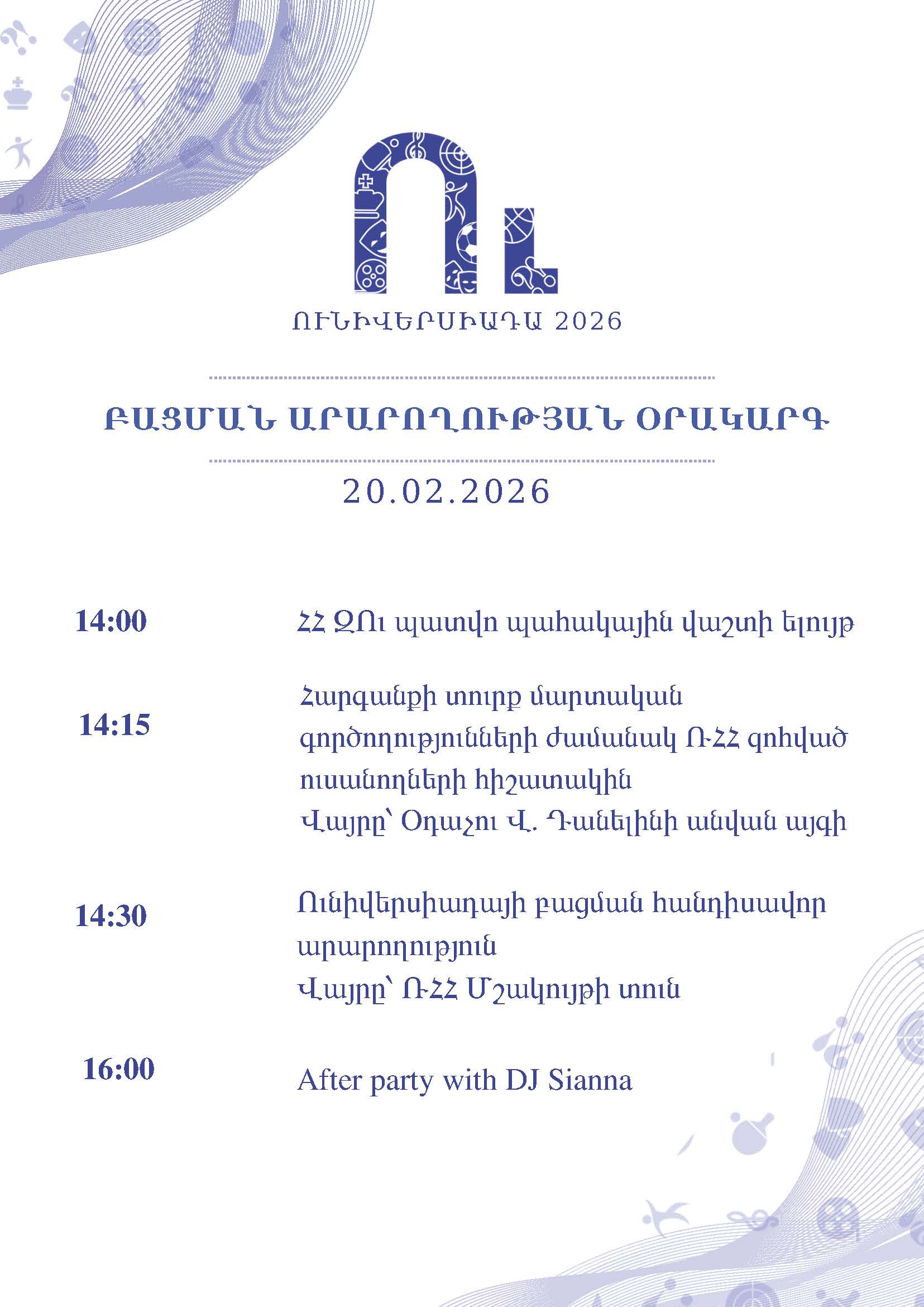 В Российско-Армянском университете 20 февраля пройдет торжественная церемония открытия межвузовского спортивно-культурной и интеллектуальной “Универсиады-2026”.