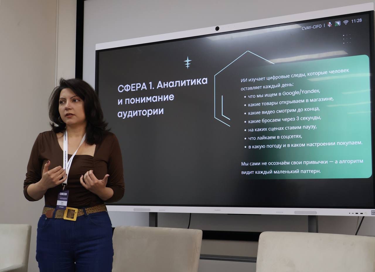 Возможности ИИ в сфере цифрового маркетинга  представила в ходе второй сессии медиаэксперт Рима Саргсян. Она рассказала о специфике применения искусственного интеллекта в медийном, рекламном и PR-маркетинге, представив участникам ряд актуальных кейсов. По ее словам, сегодня ИИ стал ключевым инструментом в анализе данных и выполнении рутинных задач. Однако стратегические, концептуальные и креативные решения по-прежнему остаются сферой человеческой компетенции.