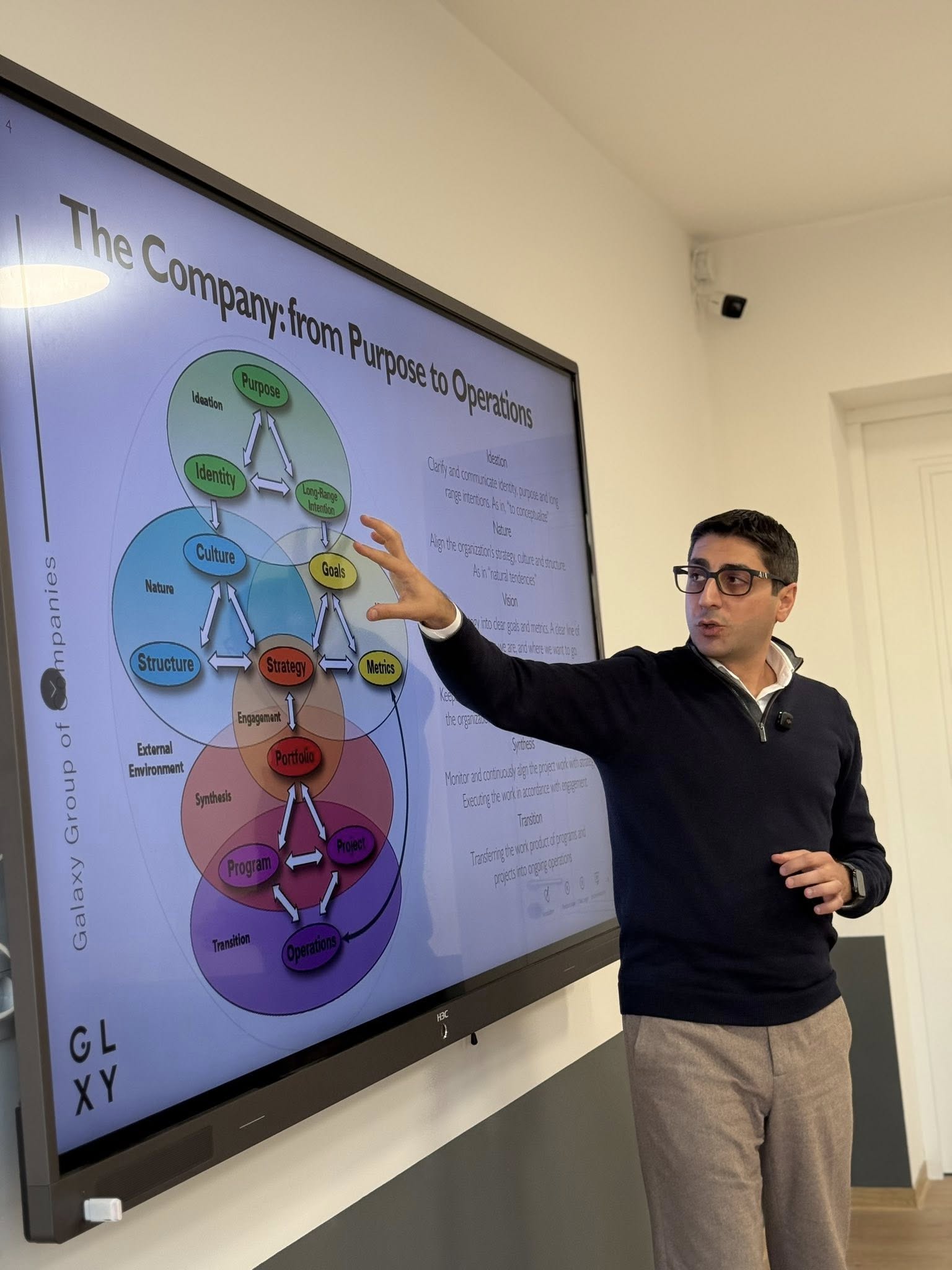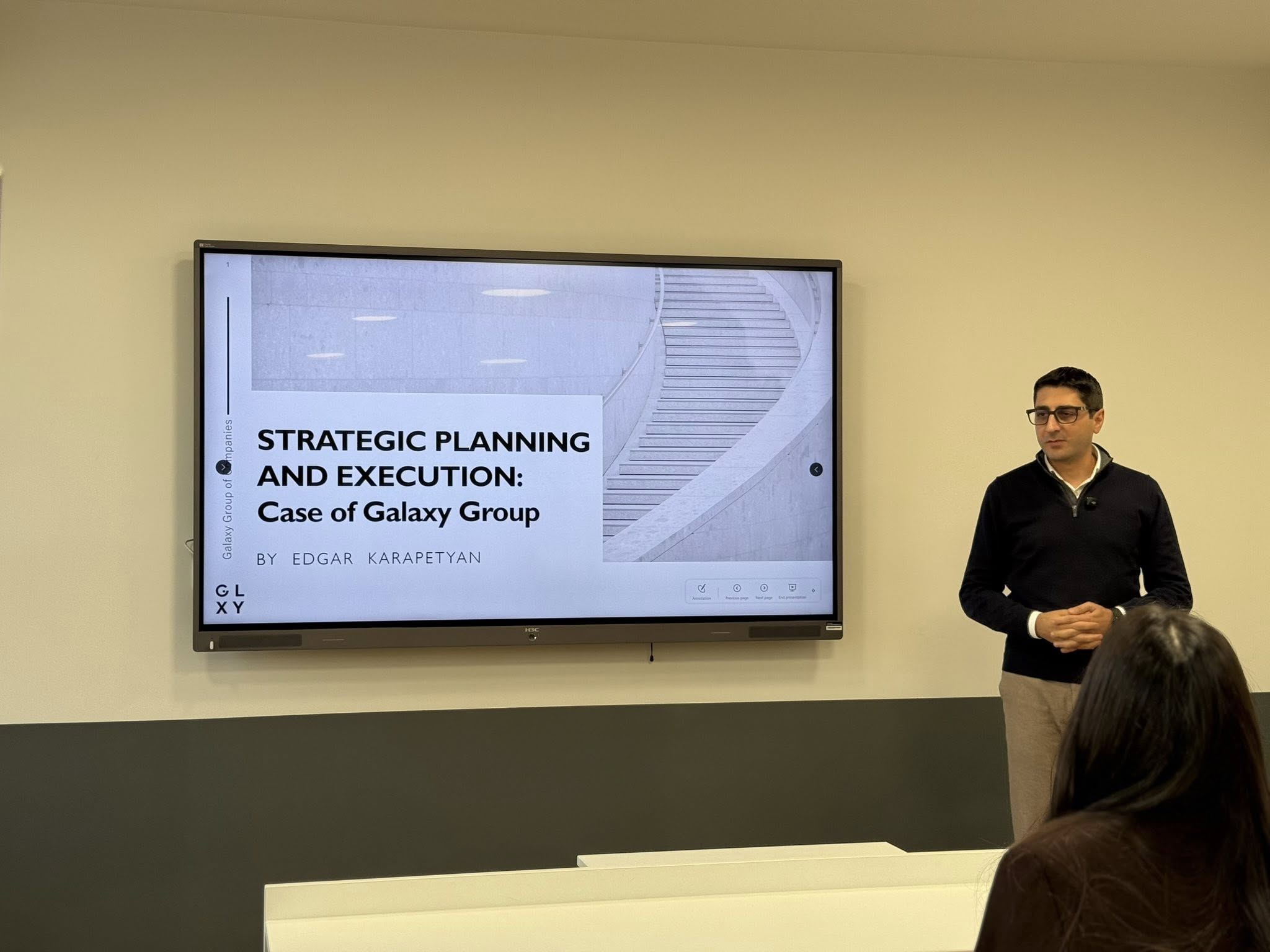 Во время мастер-класса Эдгар Карапетян рассказал, как формируется и развивается стратегия в одной из крупнейших бизнес-групп региона. На примере Galaxy Group он представил реальные кейсы, концепции и подходы к эффективному управлению диверсифицированным портфелем бизнесов и внедрению инноваций.