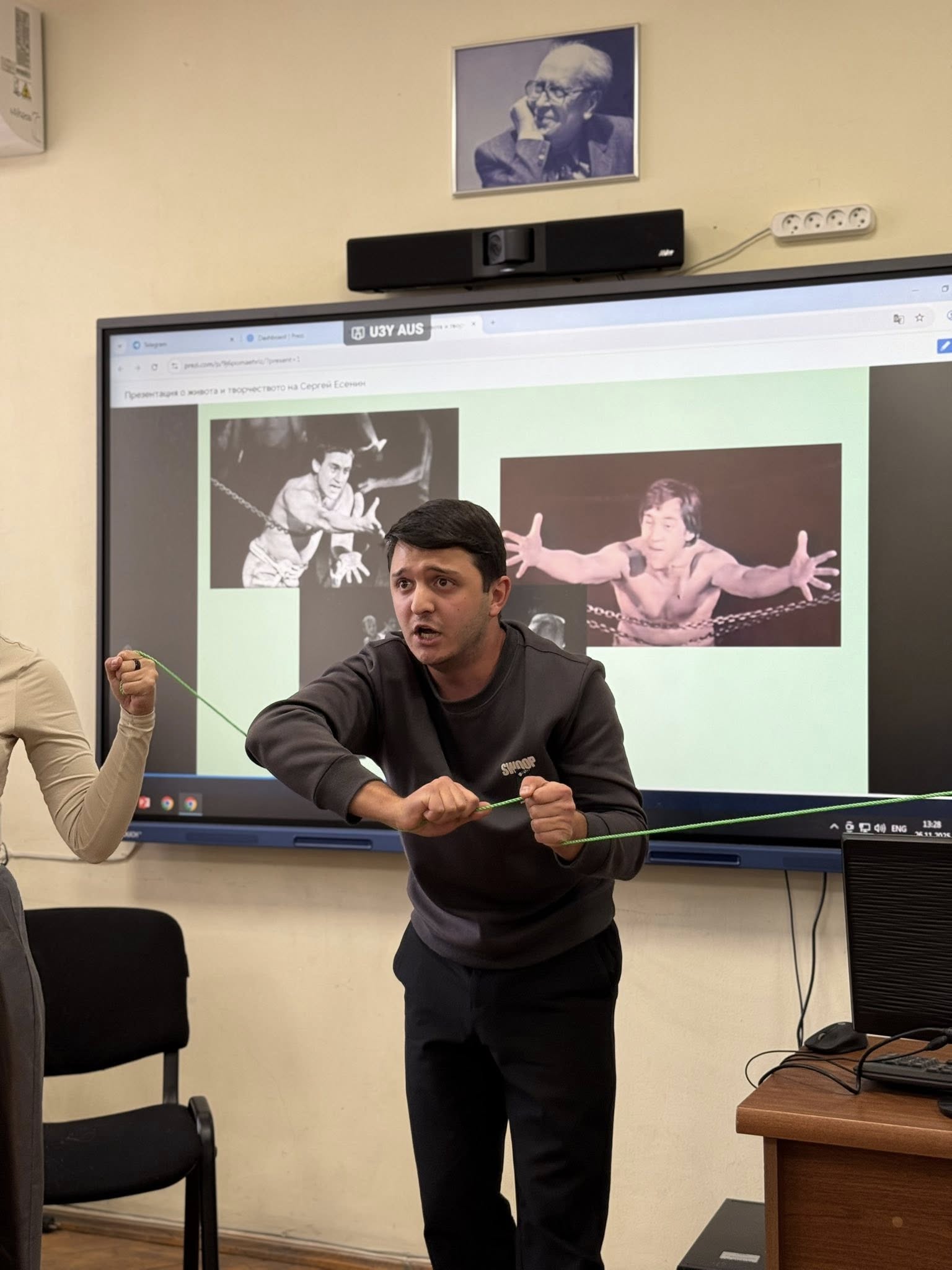 Студенты под наставничеством художественного руководителя театра РАУ "БЭМ", доцента кафедры русской и мировой литературы и культуры РАУ Соны Маргарян предложили присутствующим по-новому взглянуть на Есенина. Через ключевые периоды его творческого пути они раскрыли поэта как живого, меняющегося и противоречивого человека и художника. Участники мероприятия прочитали стихи, исполнили песни и представили небольшие театральные зарисовки.