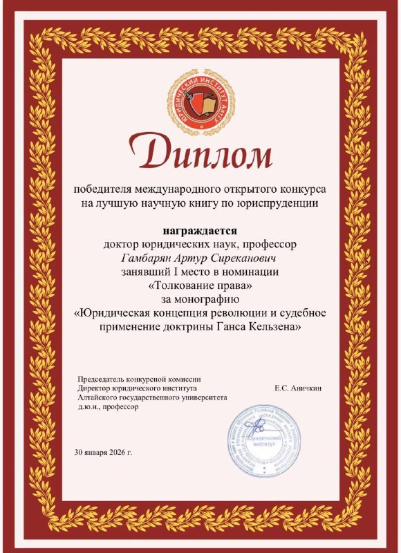 Заведующий кафедрой теории права и конституционного права Института права Российско-Армянского университета, д.ю.н., профессор Артур Сиреканович Гамбарян стал победителем Международного открытого конкурса на лучшую научную книгу по юриспруденции. Конкурс ежегодно организуется Юридическим институтом Алтайского государственного университета.