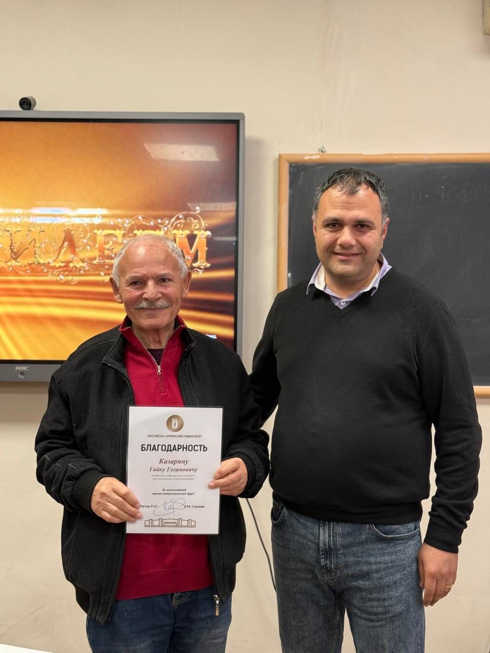 Профессору кафедры математики и математического моделирования Российско-Армянского университета Гайку Казаряну 2 декабря вручили благодарность за многолетний научно-педагогический труд.