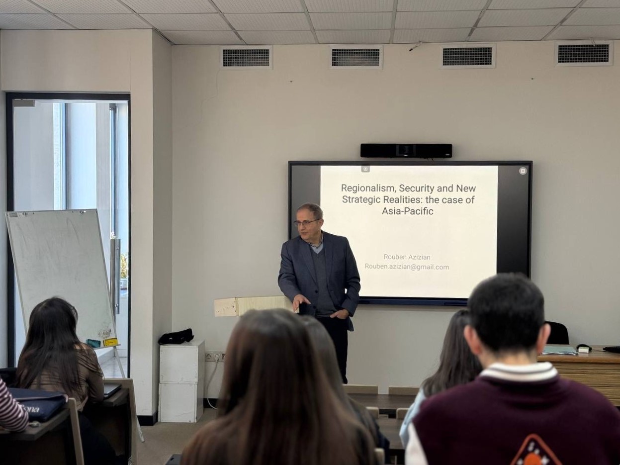 Научный семинар на тему "Регионализм, безопасность и новые стратегические реалии: уроки из Азиатско-тихоокеанского региона" состоялся в Российско-Армянском университете 14 октября. Доклад представил почётный профессор и бывший директор Центра по вопросам обороны и безопасности при Университете Мэсси (Новая Зеландия) Рубен Азизян.