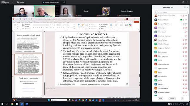 В рамках семинара профессор Инджикян затронул ключевые направления экономического развития, подчеркнув важность адаптации государственных экономических и экспортных стратегий Армении к современным цифровым реалиям.
