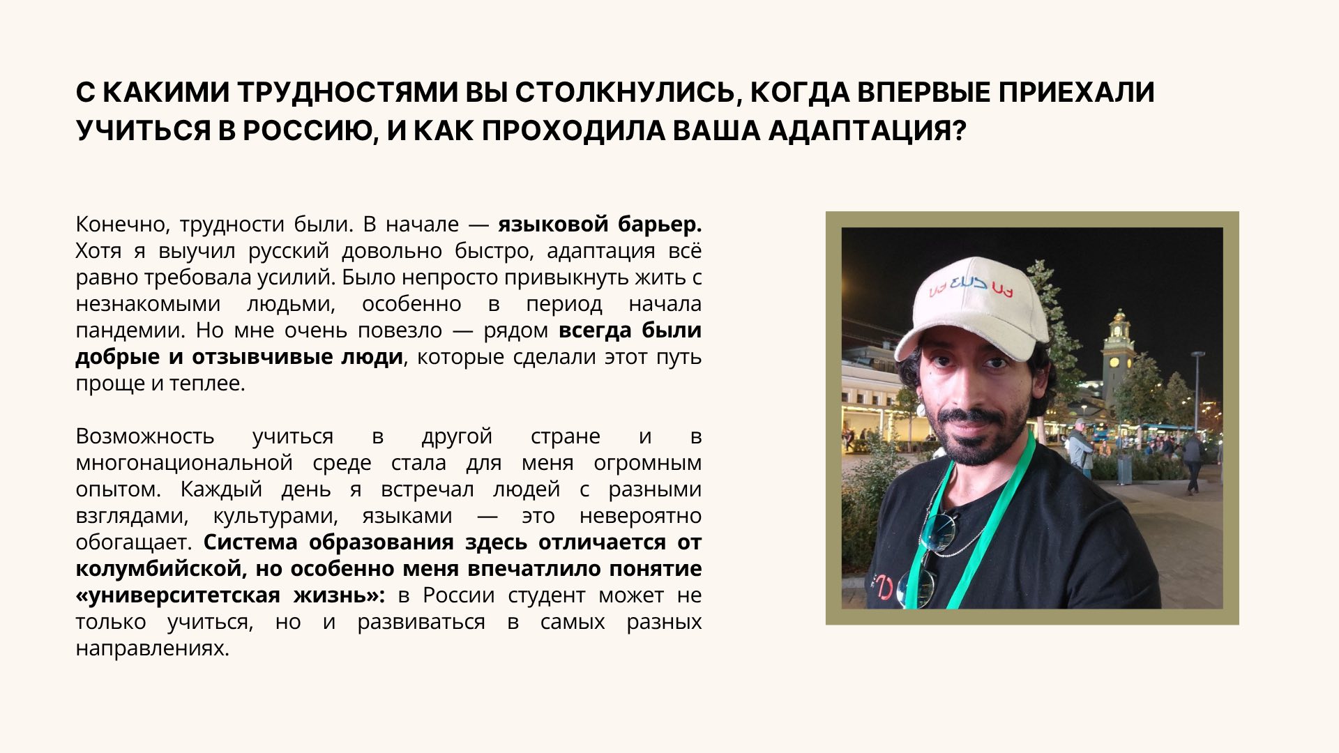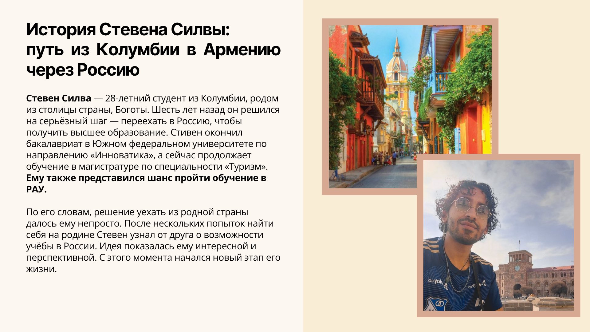 Переехать на другой конец света, оставить всё привычное и начать жизнь заново — на такое решится не каждый. Но Стевен Силва из Боготы не побоялся перемен. Несколько лет назад он отправился в Россию, чтобы получить образование и открыть для себя мир за пределами родной Колумбии. После окончания бакалавриата в Южном федеральном университете Стевен поступил в магистратуру по направлению "Туризм" и вскоре стал участником программы академического обмена, выбрав направление "Стратегическое управление" в Российско-Армянского университета.
