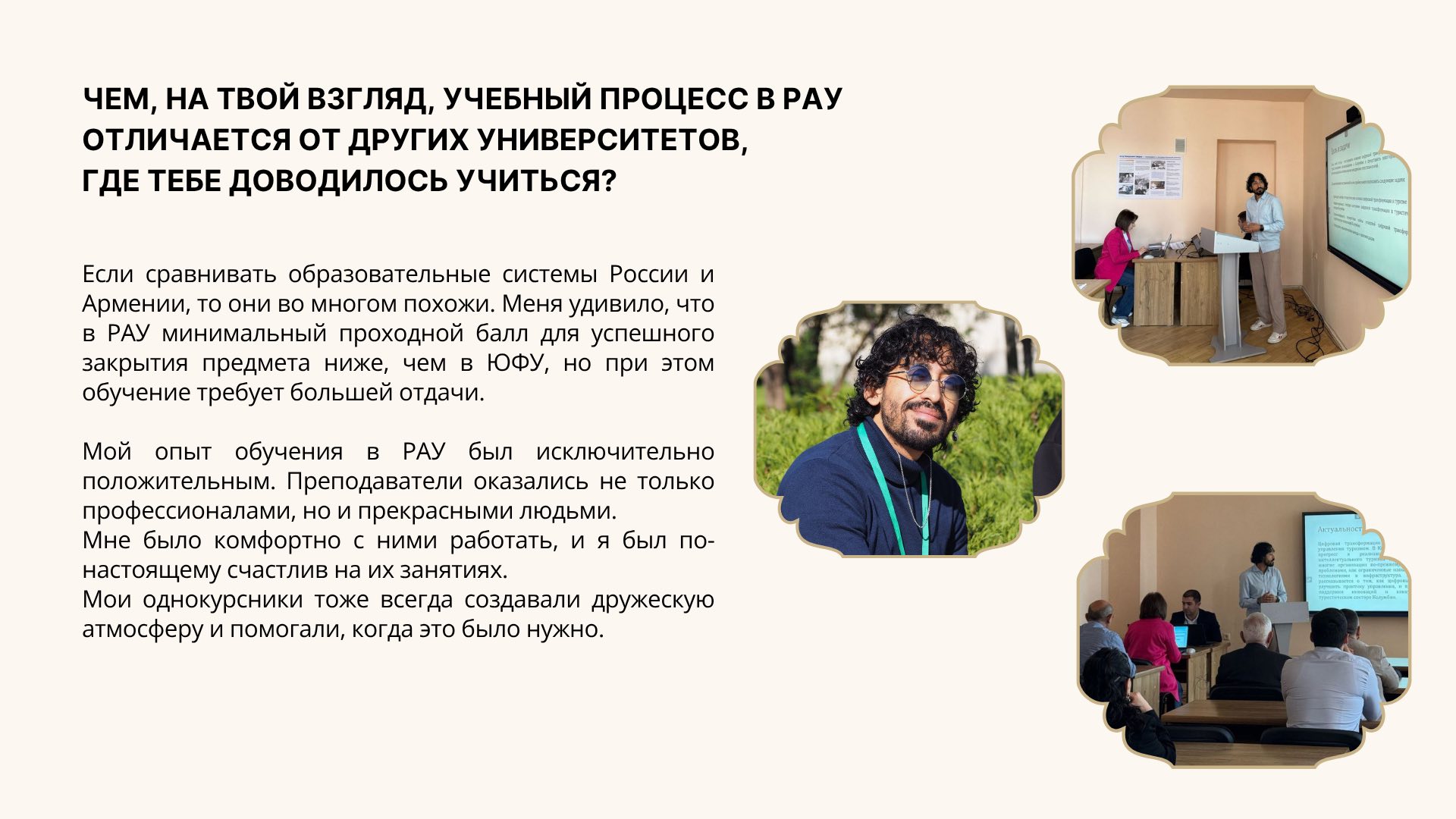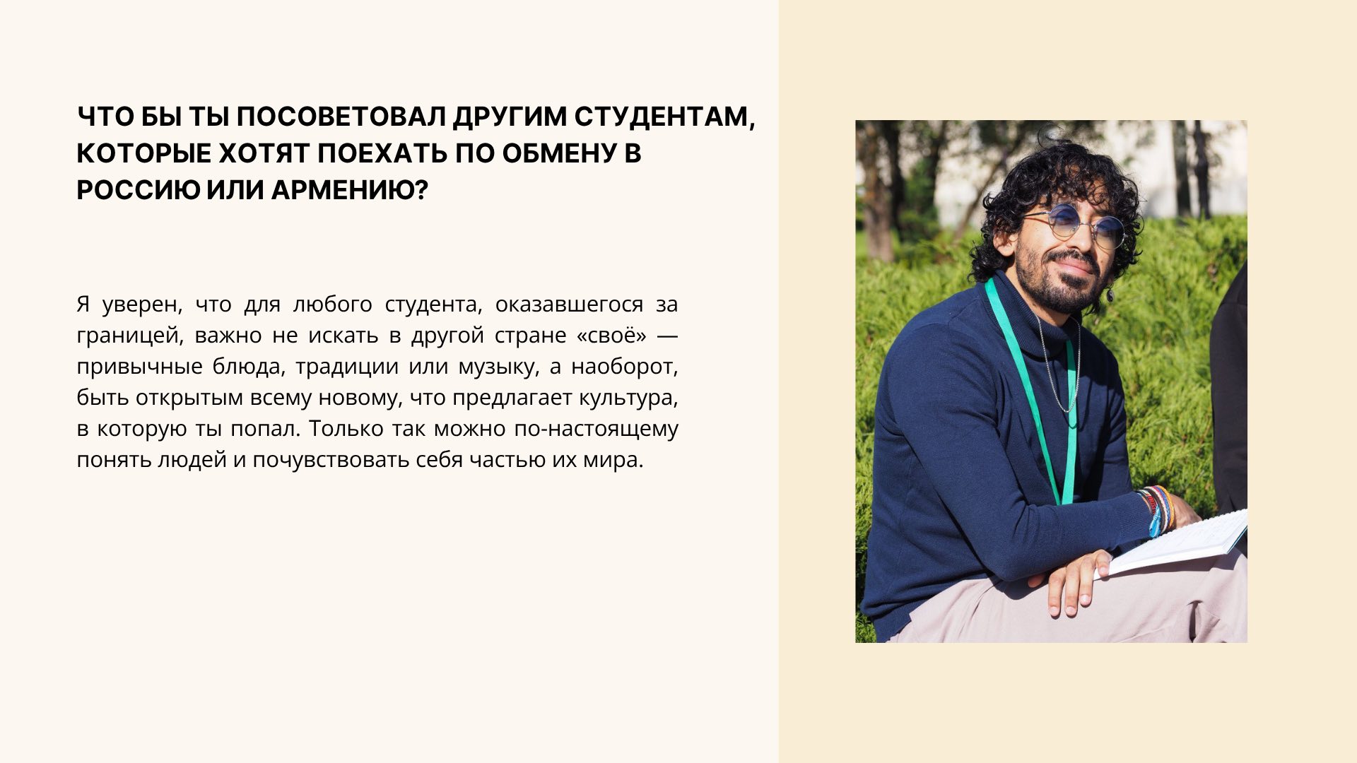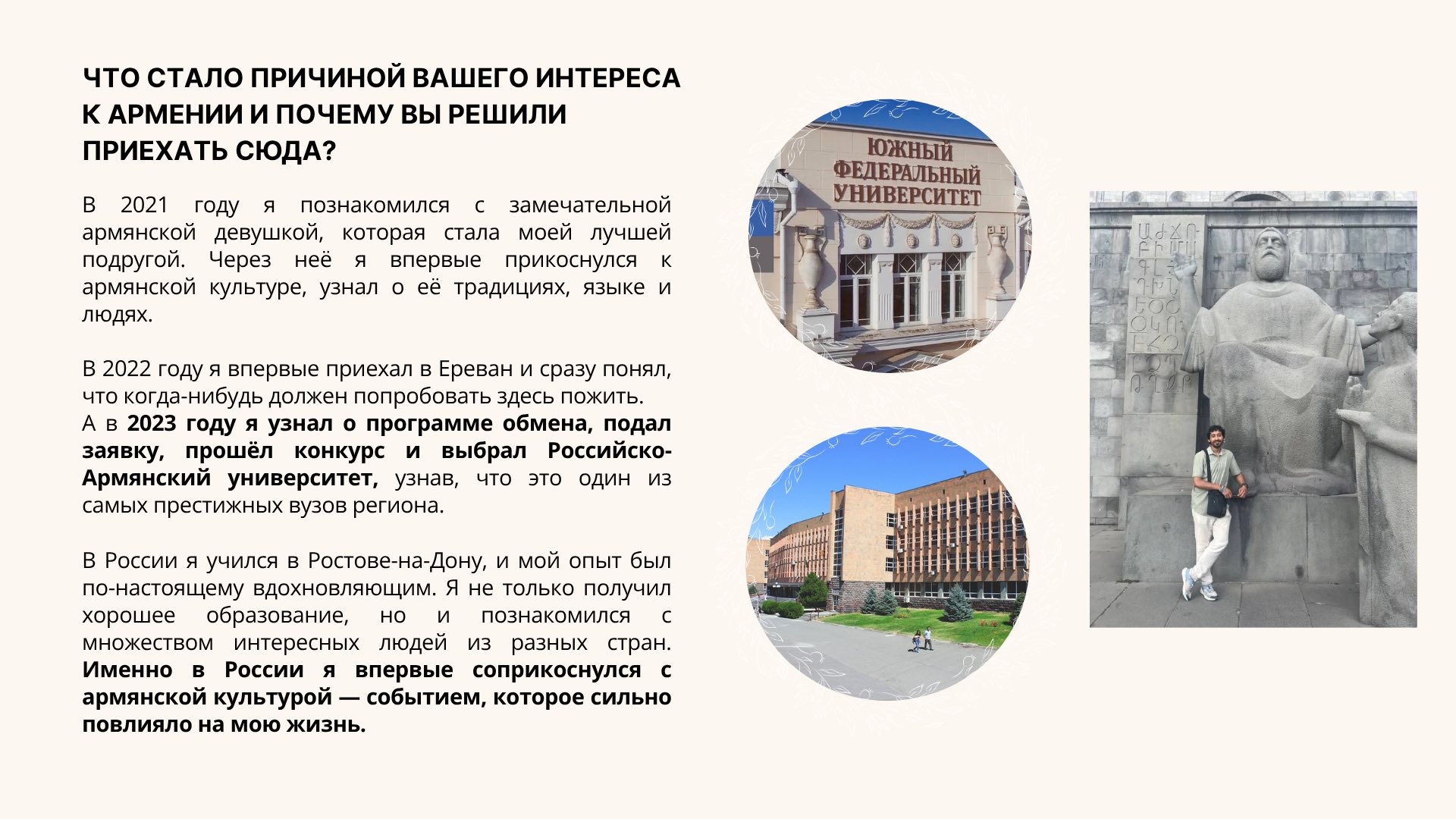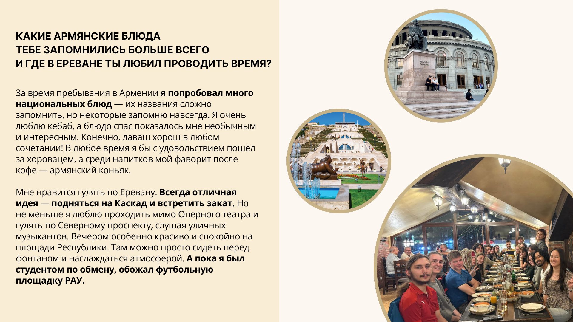 Что запомнилось студенту из Колумбии за время учёбы в Российско-Армянском университете? Какие открытия подарила Армения и почему этот опыт стал для него особенным? Своей историей делится Стевен Силва — участник программы академического обмена. Подробнее читайте в карточках ниже.