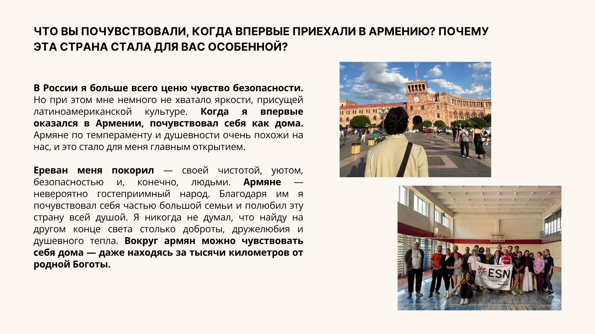"Я никогда не думал, что найду на другом конце света столько доброты, дружелюбия и душевного тепла. Вокруг армян можно чувствовать себя дома — даже находясь за тысячи километров от родной Боготы", — вспоминает Стевен.