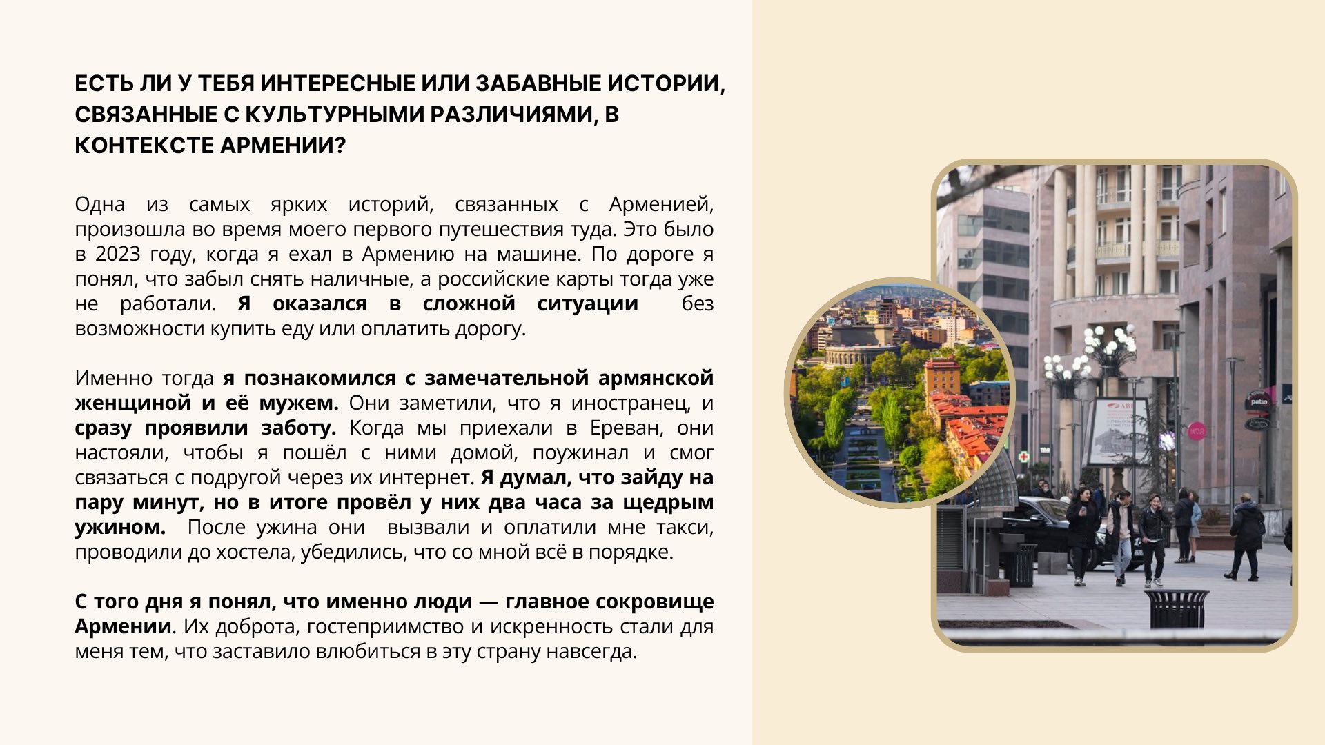 Армения встретила его по-настоящему по-домашнему — с теплом, безопасностью и искренней добротой.