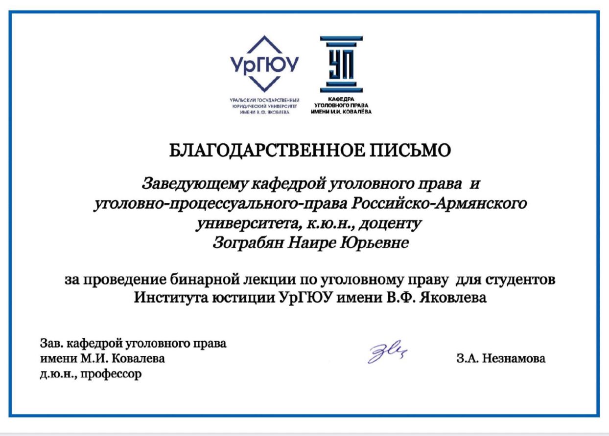 По итогам лекции Наира Зограбян была награждена благодарственным письмом за вклад в развитие сотрудничества между университетами и проведение бинарной лекции для студентов Института юстиции УрГЮУ.