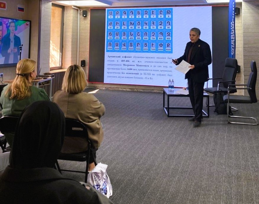 мастер-классы. На практической тренинг-сессии для педагогов-филологов старшей и высшей школы выступил Карен Акопян, проведя мастер-класс на тему "Уроки Армении: проблемные зоны русского, армянского и киргизского языков в типологическом освещении". Последовательно дифференцируя два уровня речевой деятельности – язык и речь, он представил богатство фонологической (и графической) системы армянского языка и подчеркнул возможности, таящиеся в фонетической системе русского языка, выявляемые при сопоставлении с армянским и киргизским языками. На морфологическом уровне Карен Акопян подробно описал сложности, с которыми сталкиваются армянские и киргизские обучающиеся при изучении русского языка, вызванные различием в основных грамматических способах, реализуемых русским, армянским и киргизским языками (на примере словоизменения существительных).