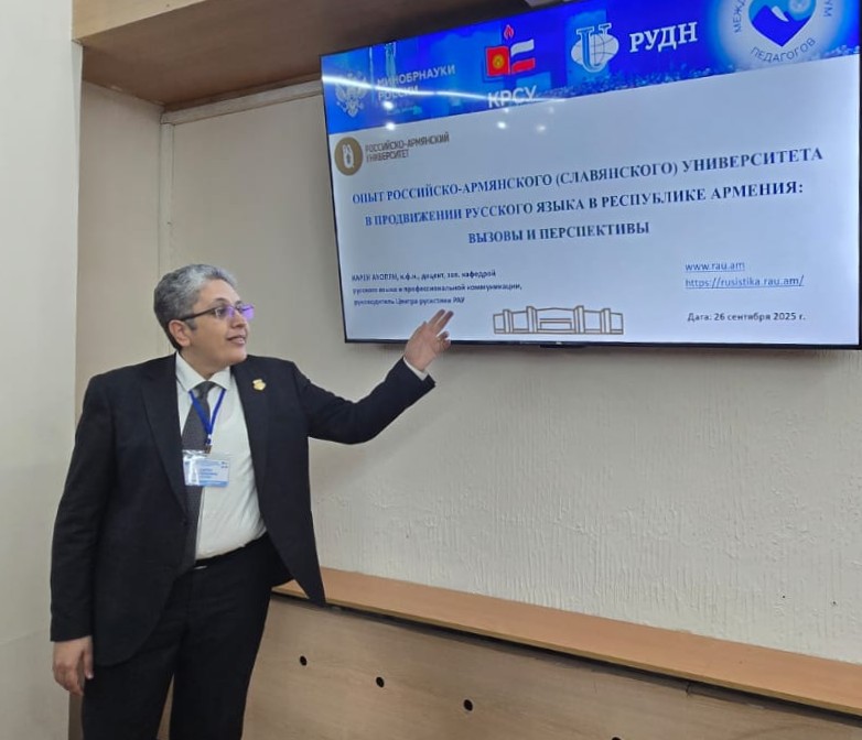 Заведующий кафедрой русского языка и профессиональной коммуникации Института филологии и межкультурной коммуникации РАУ, руководитель Центра русистики Карен Акопян, завкафедрой политологии Института международных отношений и общественно-политических наук РАУ Оганес Саркисян и завкафедрой экономической теории и проблем экономики переходного периода Института экономики и бизнеса РАУ Ирина Петросян приняли участие в Международном форуме педагогов русского языка и предметов на русском языке "Билингвальное образование сегодня: глобальные вызовы и эффективные практики". Форум прошел 26-28 сентября в Кыргызско-Российском Славянском университете имени Б.Н. Ельцина.