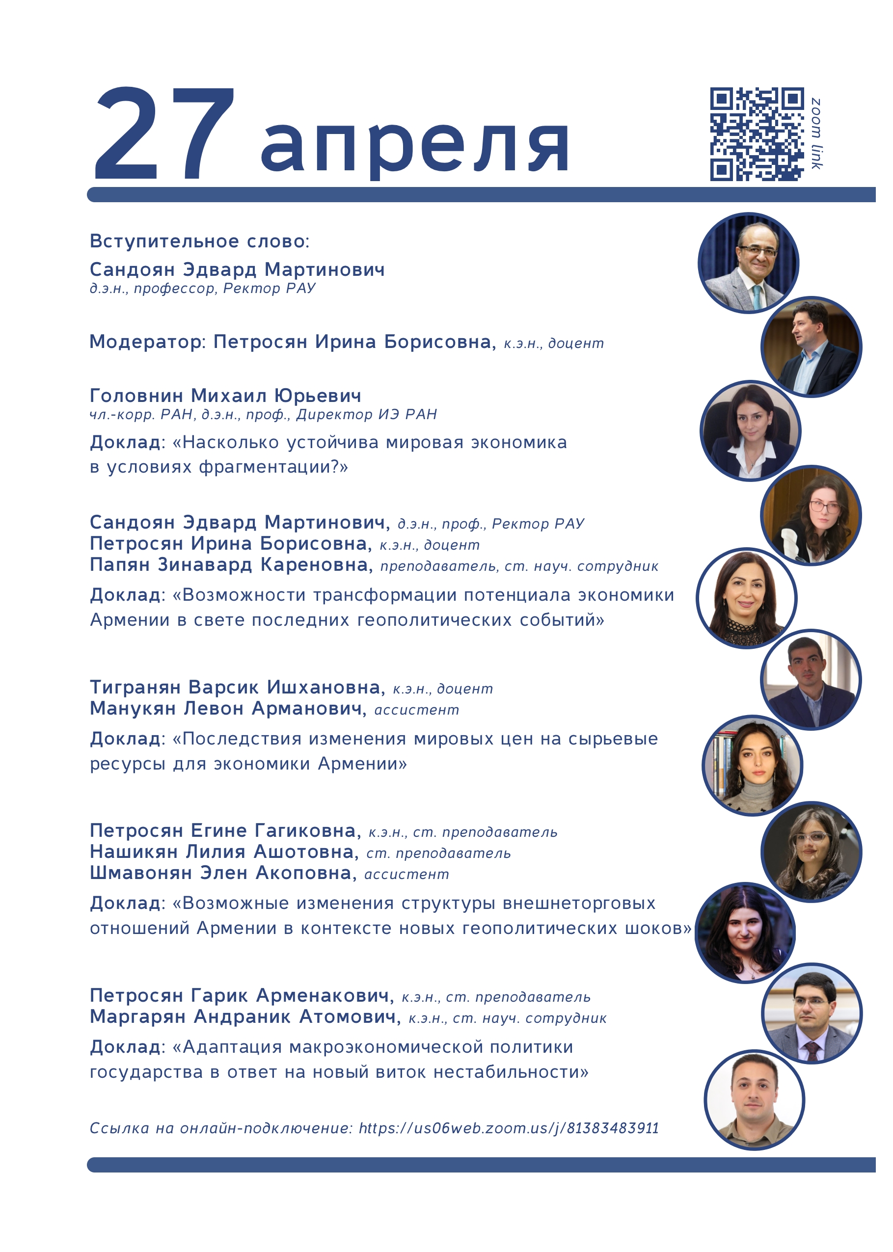 27 апреля в 13:00 в Большом конференц-зале РАУ состоится научная дискуссия на тему "Геополитические шоки и устойчивость экономического роста в условиях региональной нестабильности". Программа опубликована по ссылке >>