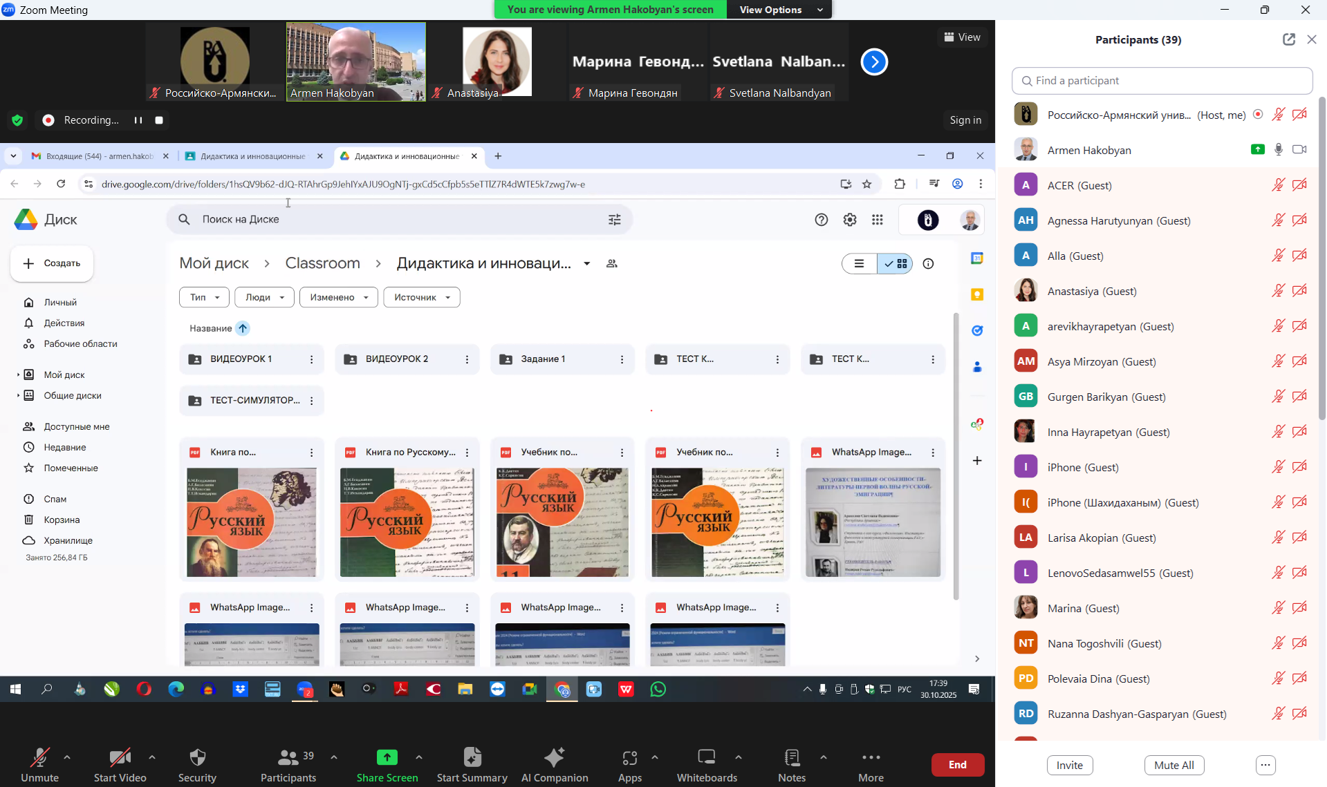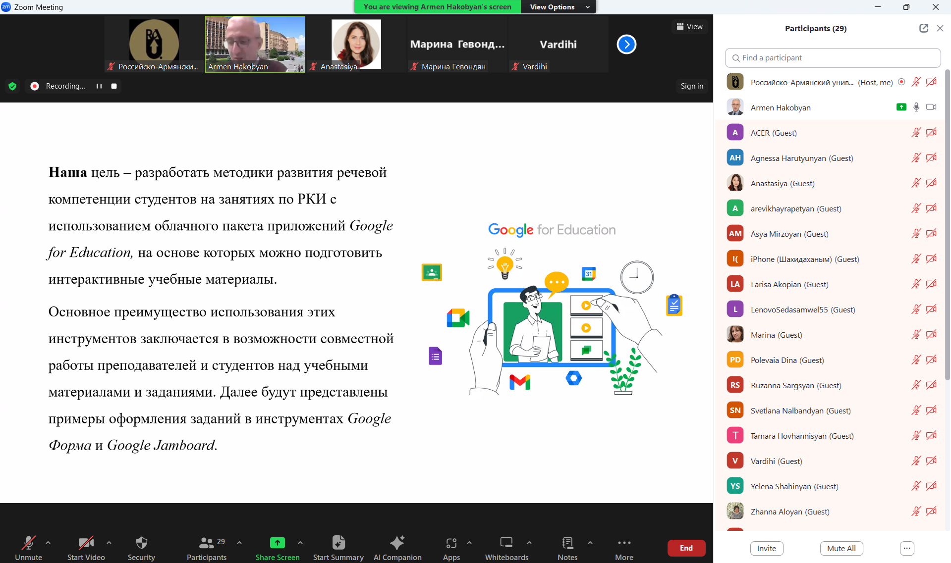 Армен Акопян, ст. преподаватель кафедры русского языка и профессиональной коммуникации, представил лекцию "Создание цифрового контента в процессе обучения русскому языку", в которой представил новый подход в методике развития речевой компетенции обучающихся на занятиях по РКИ и РКН в студенческой и/или ученической аудиториях с использованием облачного пакета приложений Google for Education. Он привел примеры использования пакета приложений Google for Education для создания интерактивных учебных материалов (Google Формы, Google Jamboard, Google Классрум с интегрированным инструментом Google Meet и мн. др.). Докладчик подчеркнул, что использование облачного пакета приложений Google for Education может значительно улучшить процесс обучения РКИ и/или РКН и развитие речевой компетенции обучающихся.
