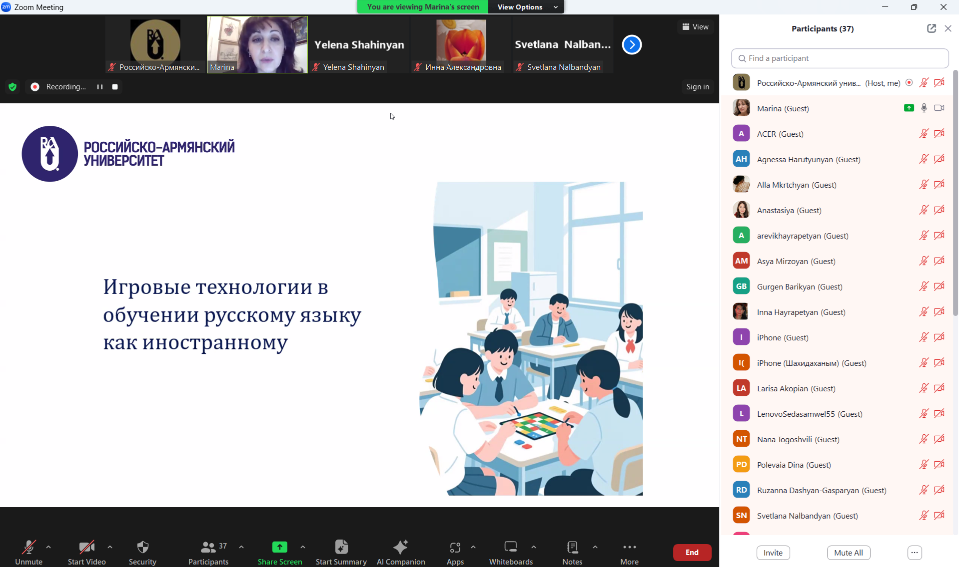 Практико-ориентированную лекцию на тему "Инновационные интерактивные методы преподавания РКИ" представила Седа Тунян, к.ф.н., доцент, доцент кафедры русского языка и профессиональной коммуникации. Она объяснила ряд терминов, связанных с объектом изучения, коснулась теоретической составляющей современного урока, провела обзор интерактивных методов и цифровых ресурсов, используемых ею на уроках по РКИ в РАУ. Лекция была построена на разборе проведенного видеоурока и сопровождалась комментариями лектора относительно примененных методов, их целей и результатов.