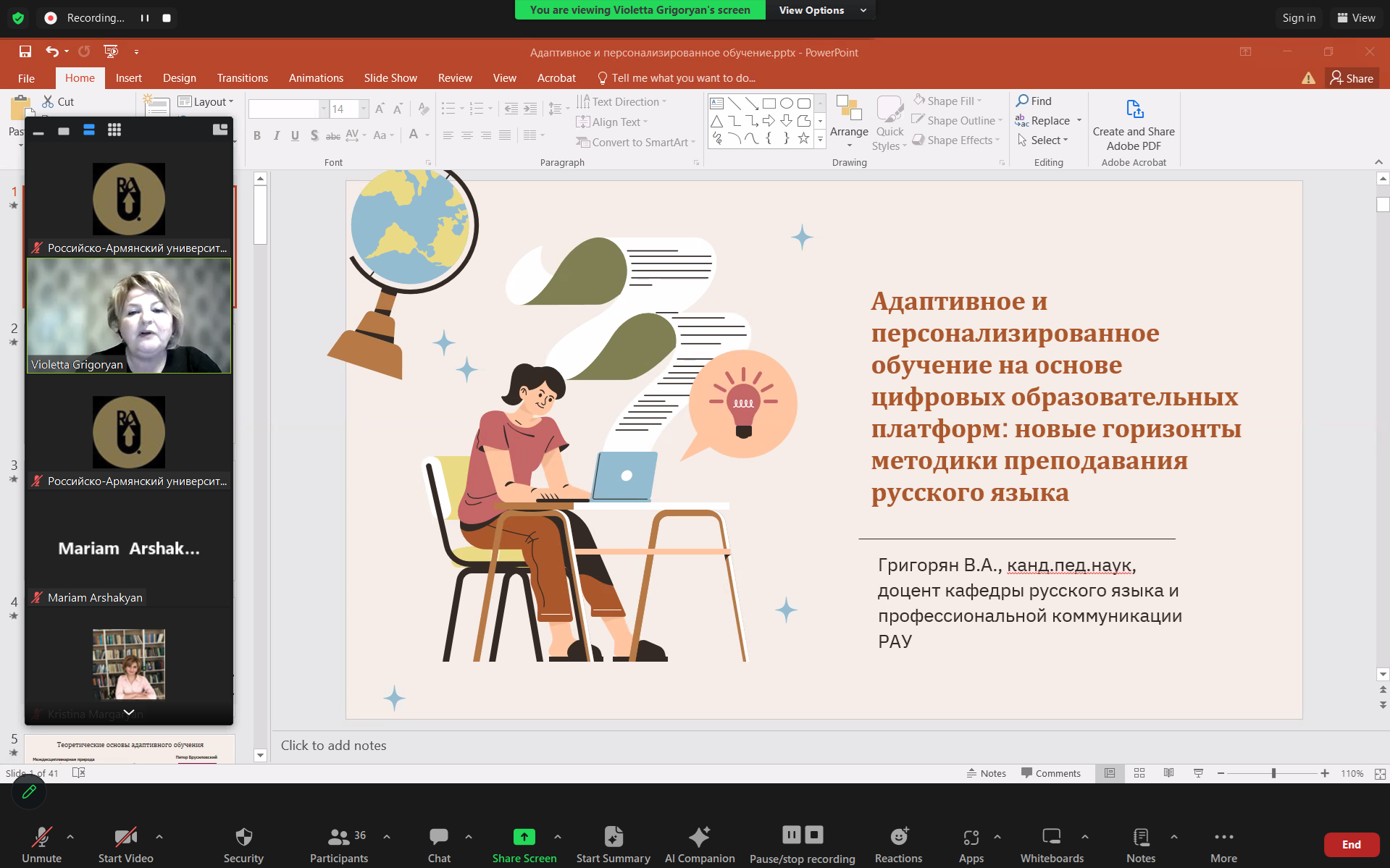 Виолетта Григорян, к.п.н., доцент, доцент кафедры русского языка и профессиональной коммуникации, представила лекцию на тему "Адаптивное и персонализированное обучение на основе цифровых образовательных платформ: новые горизонты методики преподавания русского языка". В своем выступлении докладчик представила современные подходы к индивидуализации образовательного процесса на основе цифровых технологий, а также примеры эффективного использования адаптивных платформ, таких как Smart Sparrow, Knewton, Duolingo, ЯндексУчебник и Moodle, в преподавании русского языка. Она отметила значимость роли преподавателя и учителя как координатора персонализированного обучения, способствующего развитию самостоятельности и мотивации обучающихся.