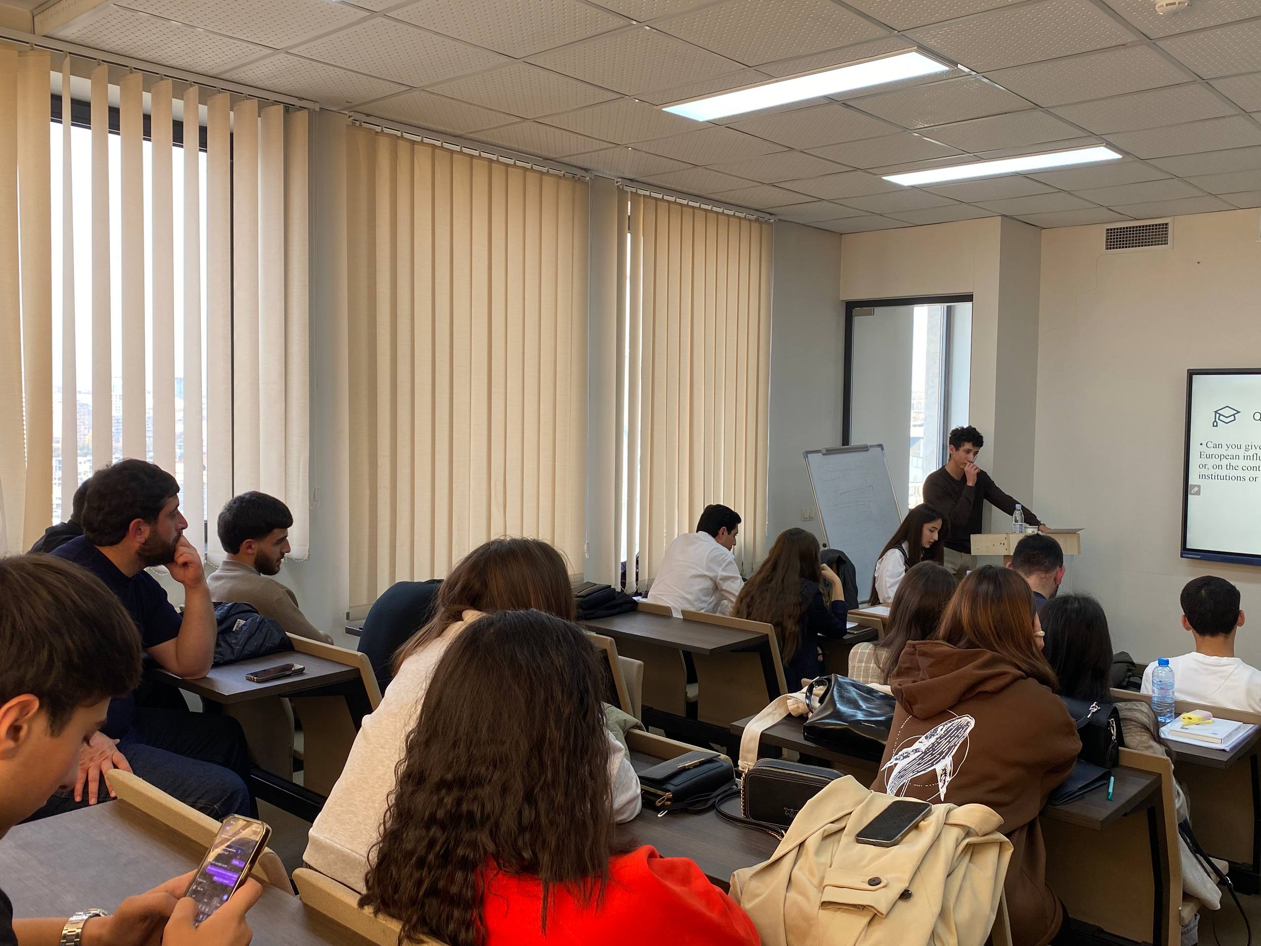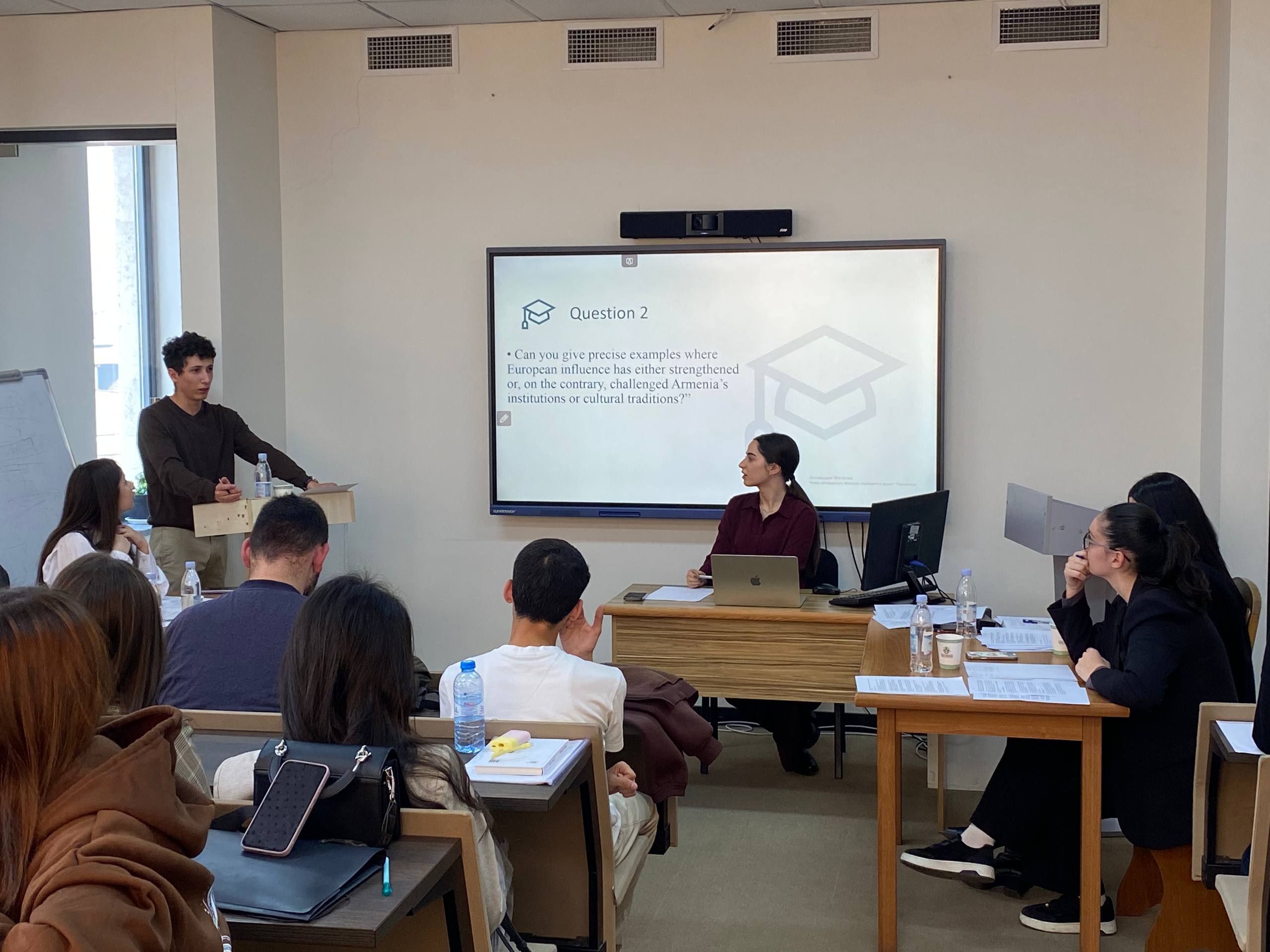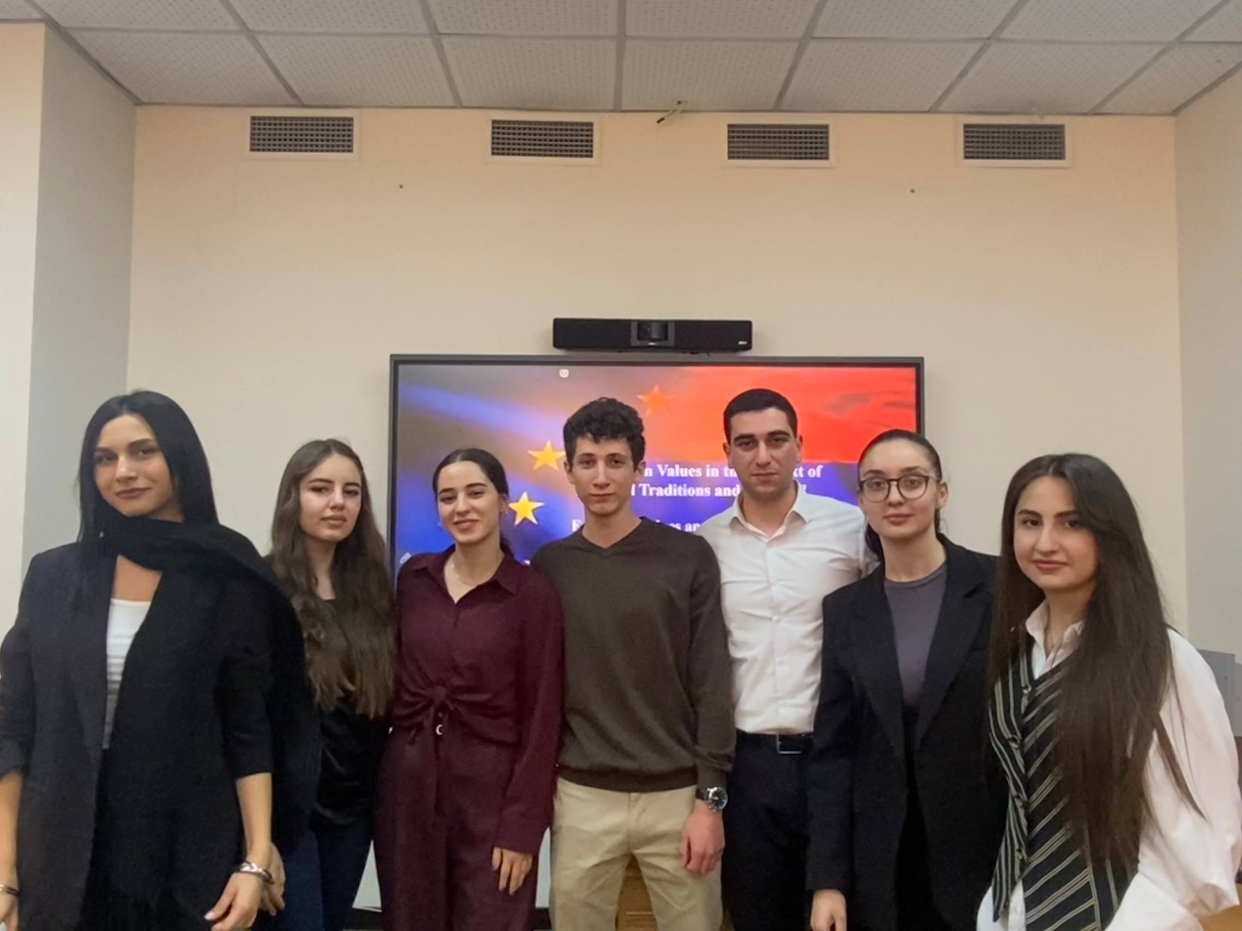 Семинар-дебаты на тему "Европейские ценности в контексте национальных традиций и культуры" состоялись в Российско-Армянском университете 13 ноября. Студенты по направлению "Международные отношения" и преподаватель РАУ Карине Хачатрян провели аргументированные дискуссии, в ходе которых стороне оппозиции необходимо было подготовить ответы на поставленные вопросы, касающиеся национальной идентичности, европейского влияния на институциональное развитие страны и др.