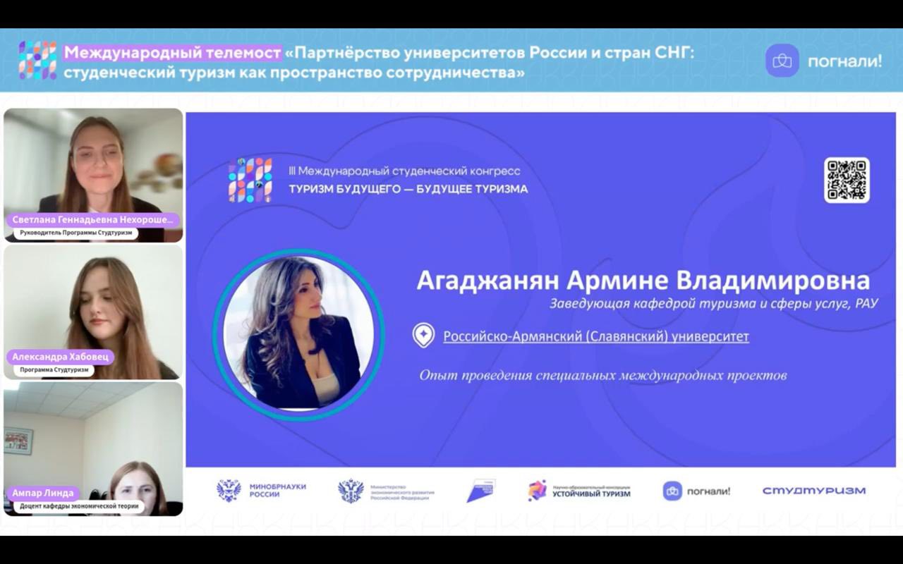 Конгресс собрал студентов и преподавателей университетов России, стран СНГ, ШОС и БРИКС. Среди спикеров мероприятия - заведующая кафедрой туризма и сферы услуг Российско-Армянского университета Армине Агаджанян, выступившая от имени международных вузов-партнёров программы "Студтуризм". В своём докладе она отметила значимость обмена опытом между молодыми специалистами разных стран и роль академического сообщества в формировании устойчивого туризма будущего.